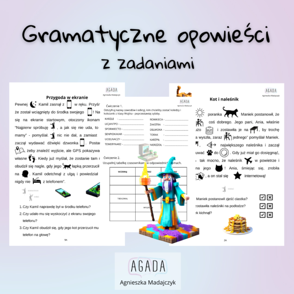 13 wyjątkowych opowiadań z ćwiczeniami gramatycznymi (26 stron do pracy!) – pomoc do wykorzystania z dziećmi w wieku szkolnym oraz z nastolatkami ze specjalnymi potrzebami edukacyjnymi (NI). Moi pacjenci je uwielbiają! Materiały możesz wykorzystać do: