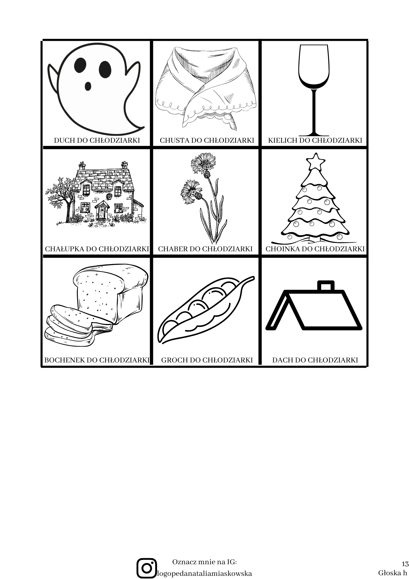 – 3 karty pracy z głoską h w nagłosowych grupach dwuspółgłoskowych (h + c, ć, f, l, ł, r), śródgłosowych grupach dwuspółgłoskowych (h + f, ł, r), wygłosowych grupach dwuspółgłoskowych (h + ł, ś),