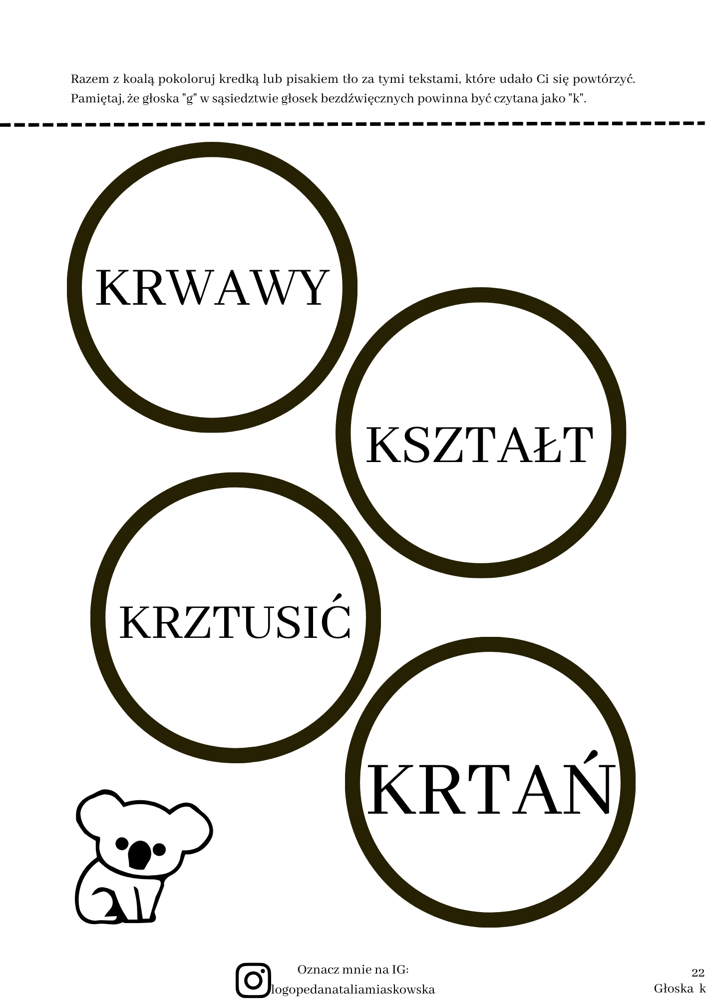 – karta pracy z głoską k w wyrazach, w których po głosce k występuje spółgłoska