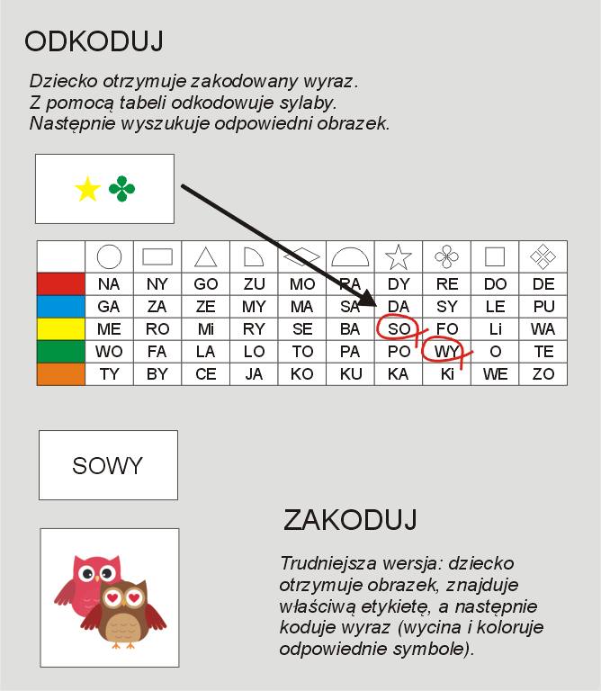 Zestaw zawiera 45 etykiet + 45 kodów etykiet, 45 obrazków, tabelę kodującą, symbole do wycięcia i kolorowania.