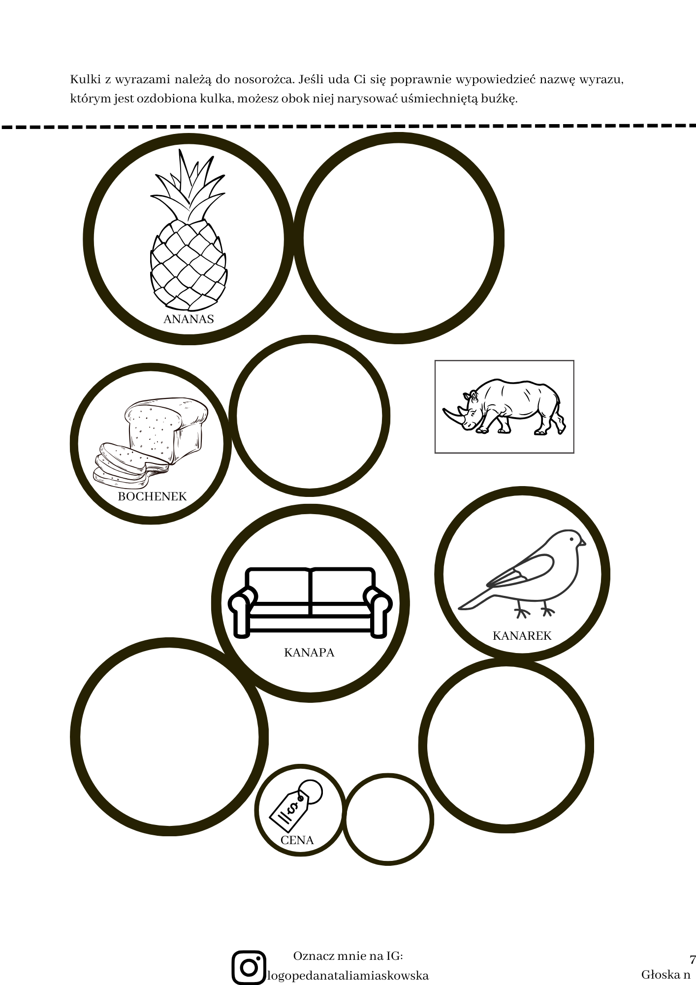– zawiera 3 karty pracy z głoską “n” w sylabach i logatomach, z podziałem na sylaby z głoską “n” w nagłosie, śródgłosie i wygłosie