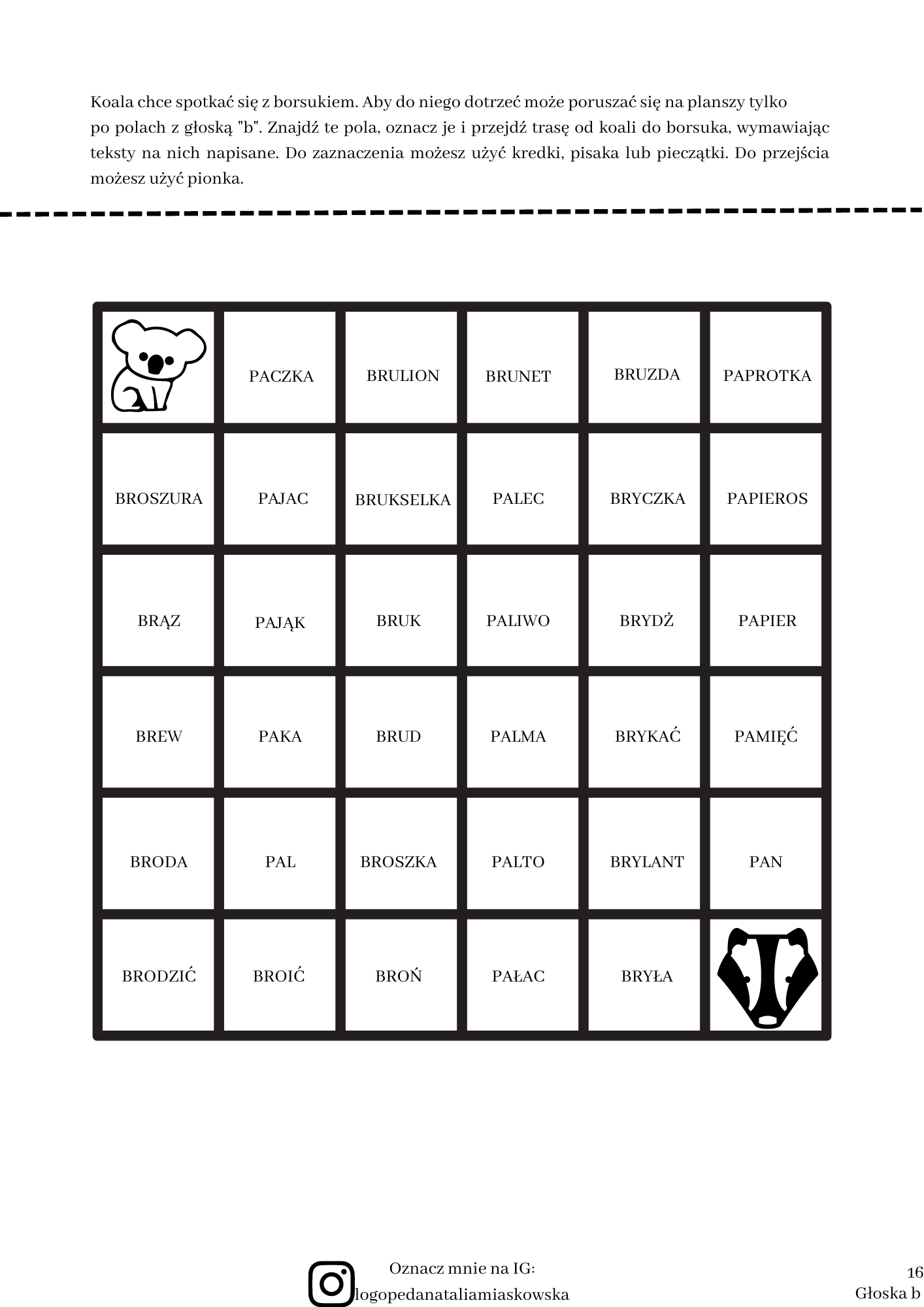 – zawiera kartę pracy z głoską “b” w złożeniach wyrazowych, w których po głosce “b” następuje spółgłoska