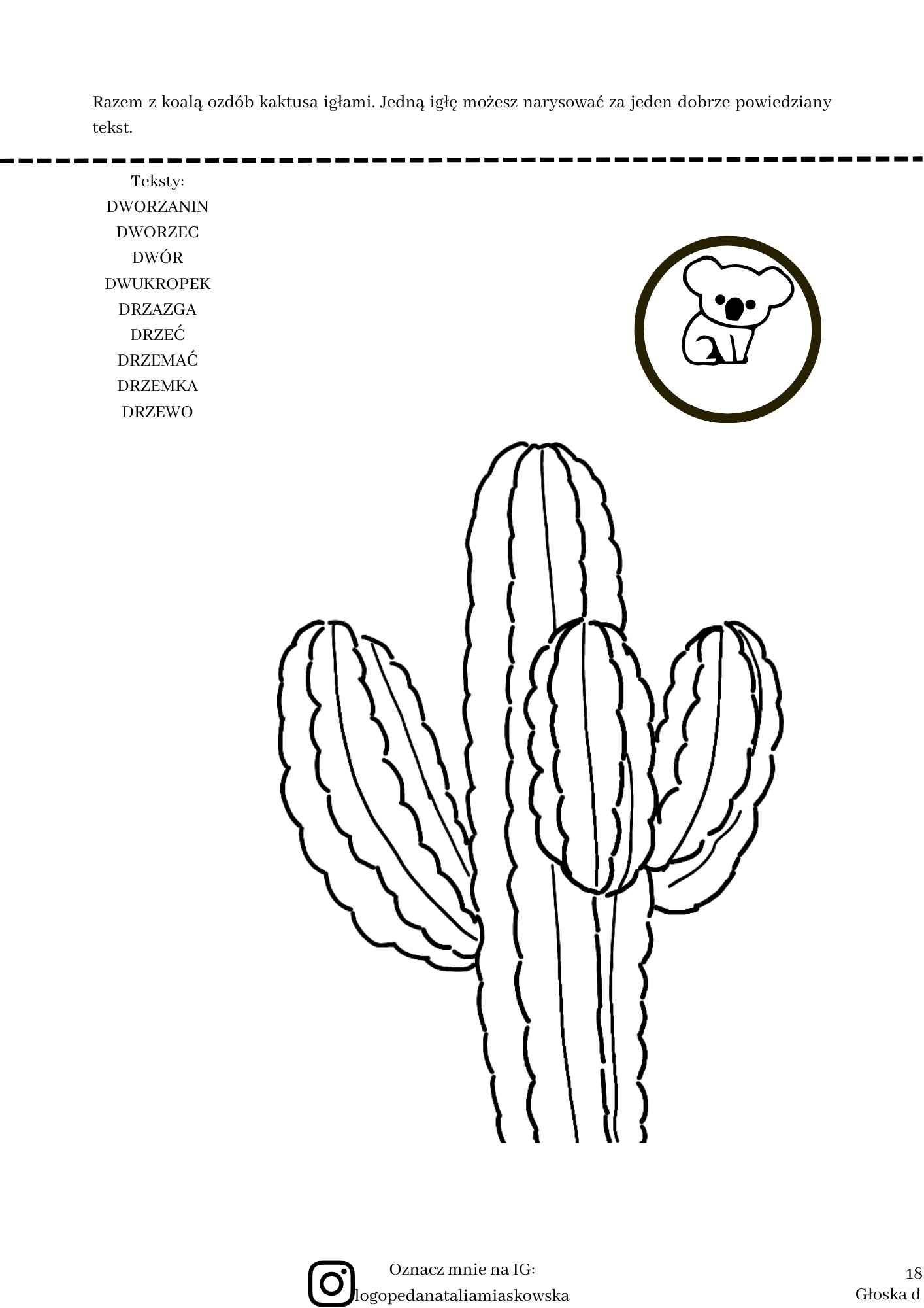 – zawiera kartę pracy z głoską “d” w nagłosowych grupach trójspółgłoskowych (“d” + ” rg, rw, rż”)