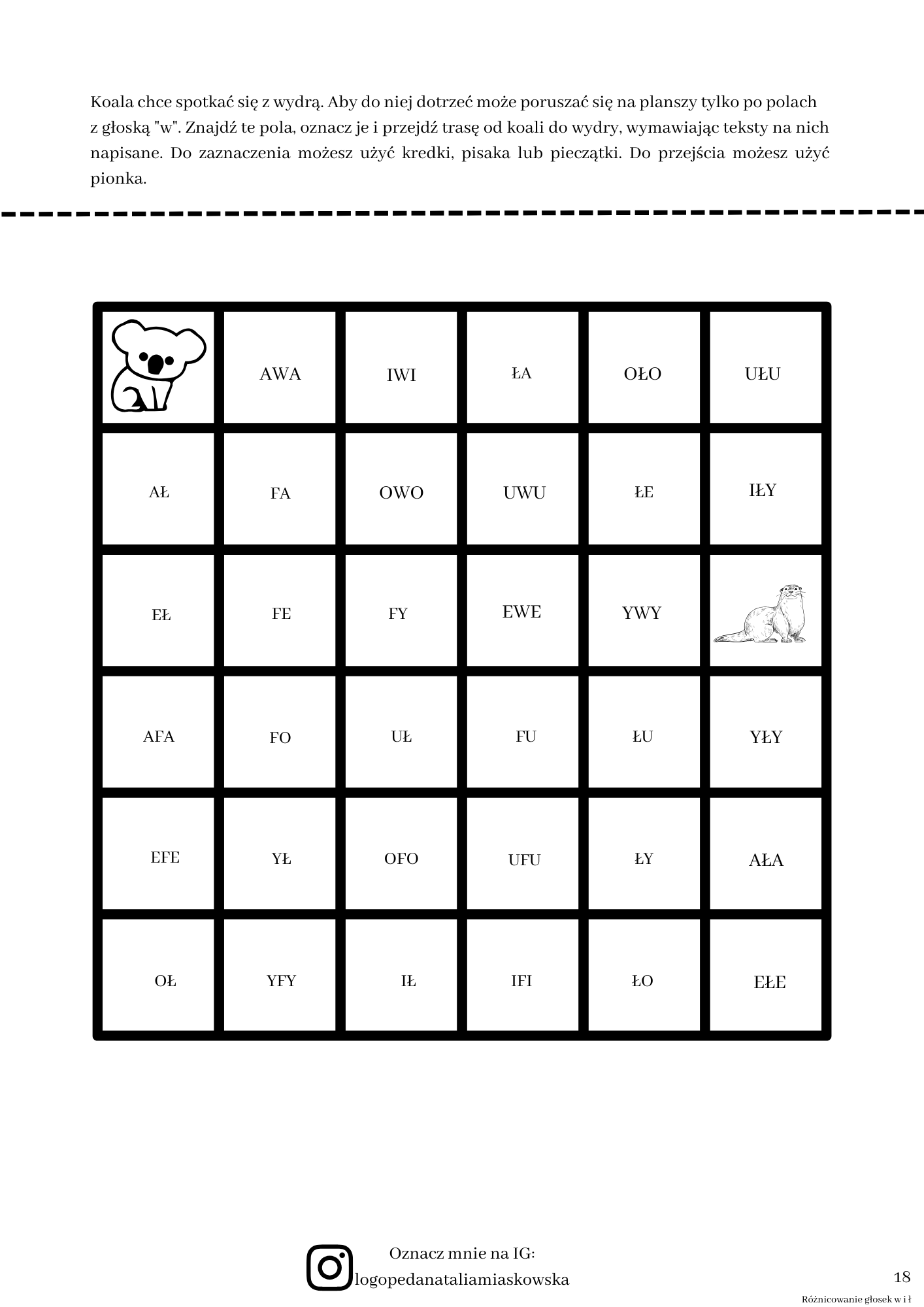 – zawiera kartę pracy z zakresu różnicowania głosek „w” i „ł” w sylabach śródgłosowych