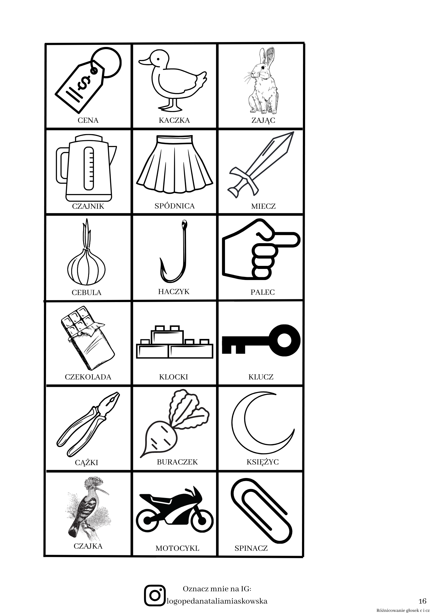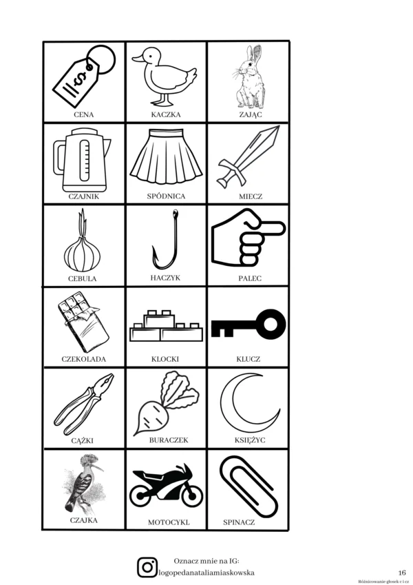 – zawiera kartę pracy z zakresu różnicowania głosek „c” i „cz” w wyrazach w różnych pozycjach