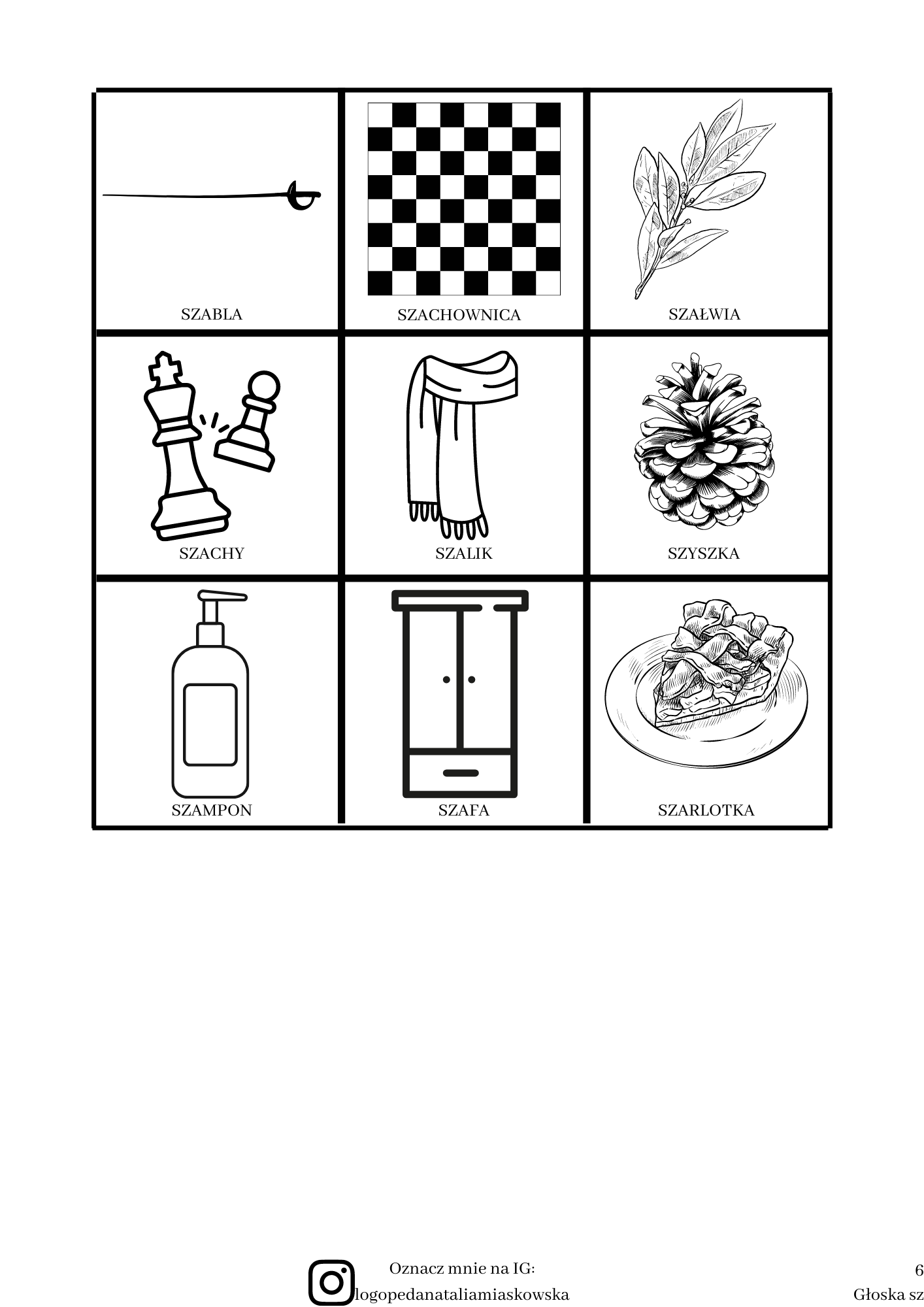 – zawiera 3 karty pracy z głoską “sz” w sylabach i logatomach, z podziałem na sylaby z głoską “sz” w nagłosie, śródgłosie i wygłosie