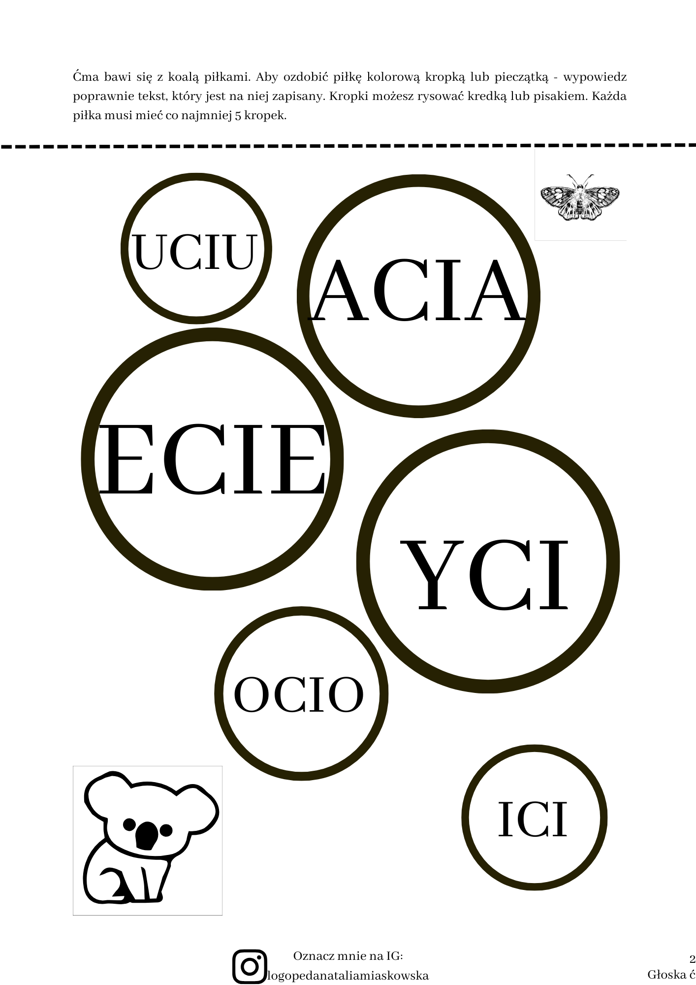 – zawiera 3 karty pracy z głoską “ć” w sylabach i logatomach, z podziałem na sylaby z głoską “ć” w nagłosie, śródgłosie i wygłosie