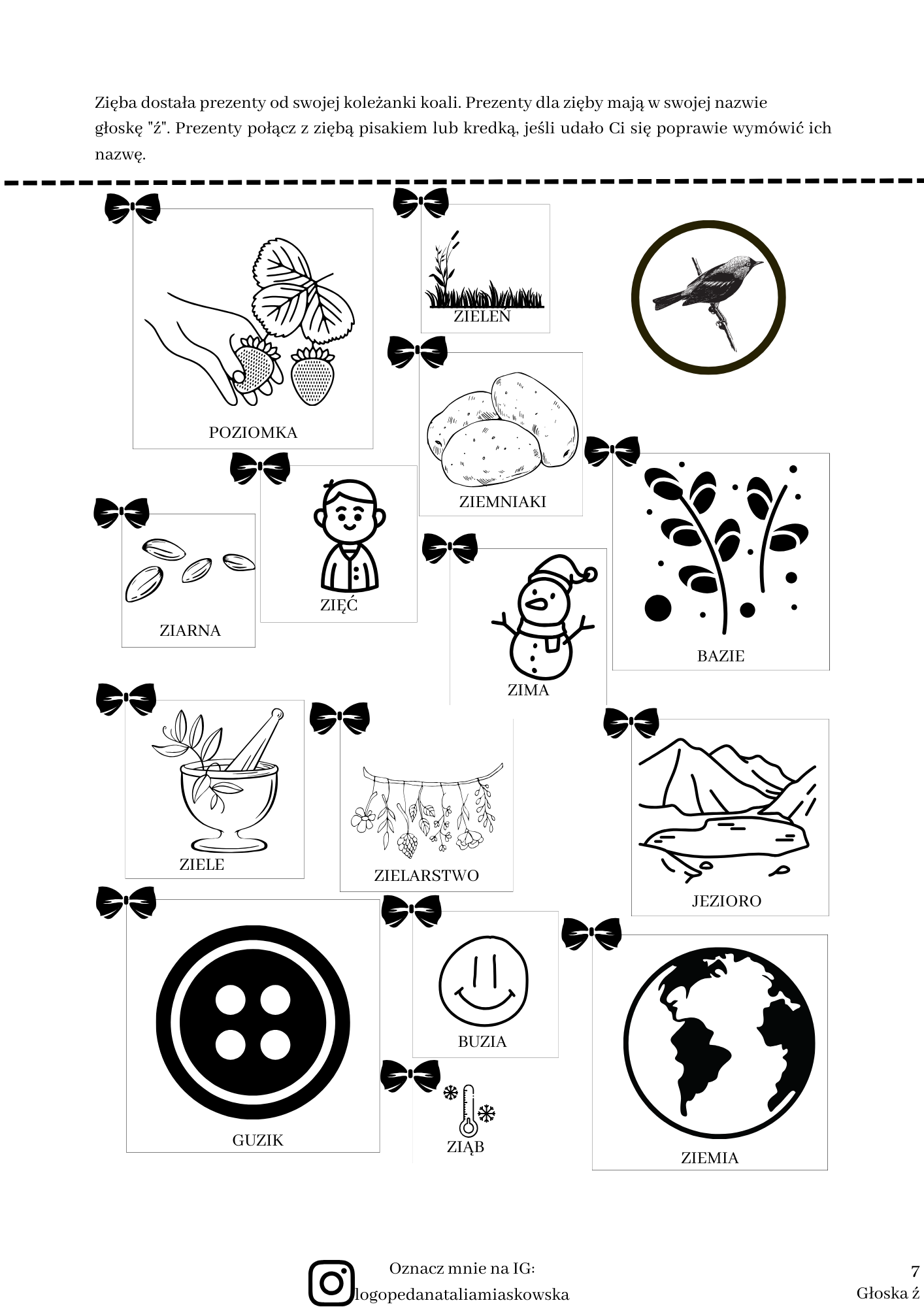– zawiera kartę pracy z głoską “ź” w sylabach i logatomach w różnych pozycjach