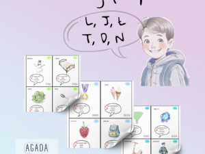 Na końcu znajdziesz materiał z paskami do wycięcia i przeciągania z głoskami: ł, m, t, w, z